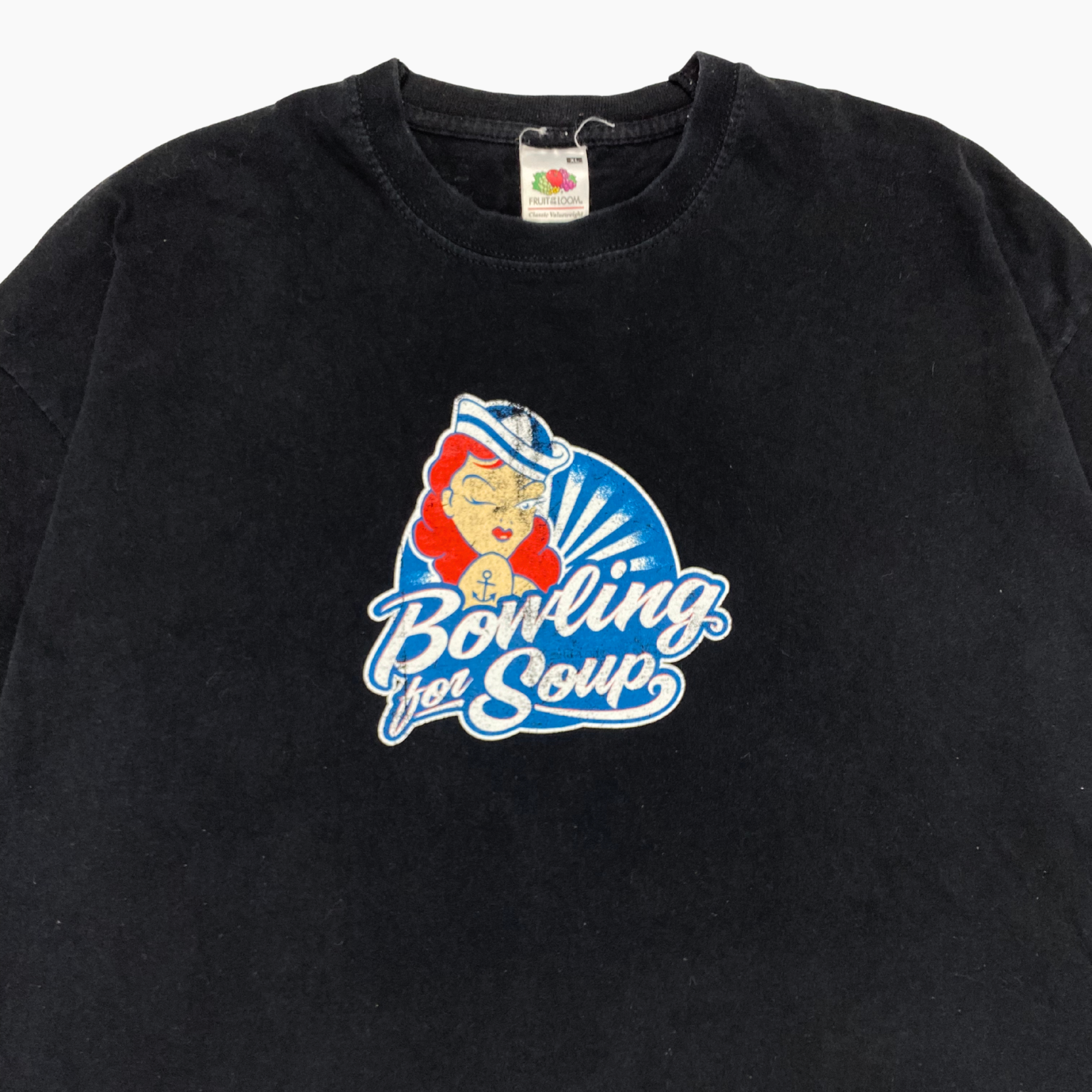 A real good 2000s tee from the American rock band Bowling For Soup. Screen printed front graphics of a sailor and the bands name. Comes on a black, 100% cotton, Fruit of the Loom valueweight t-shirt.