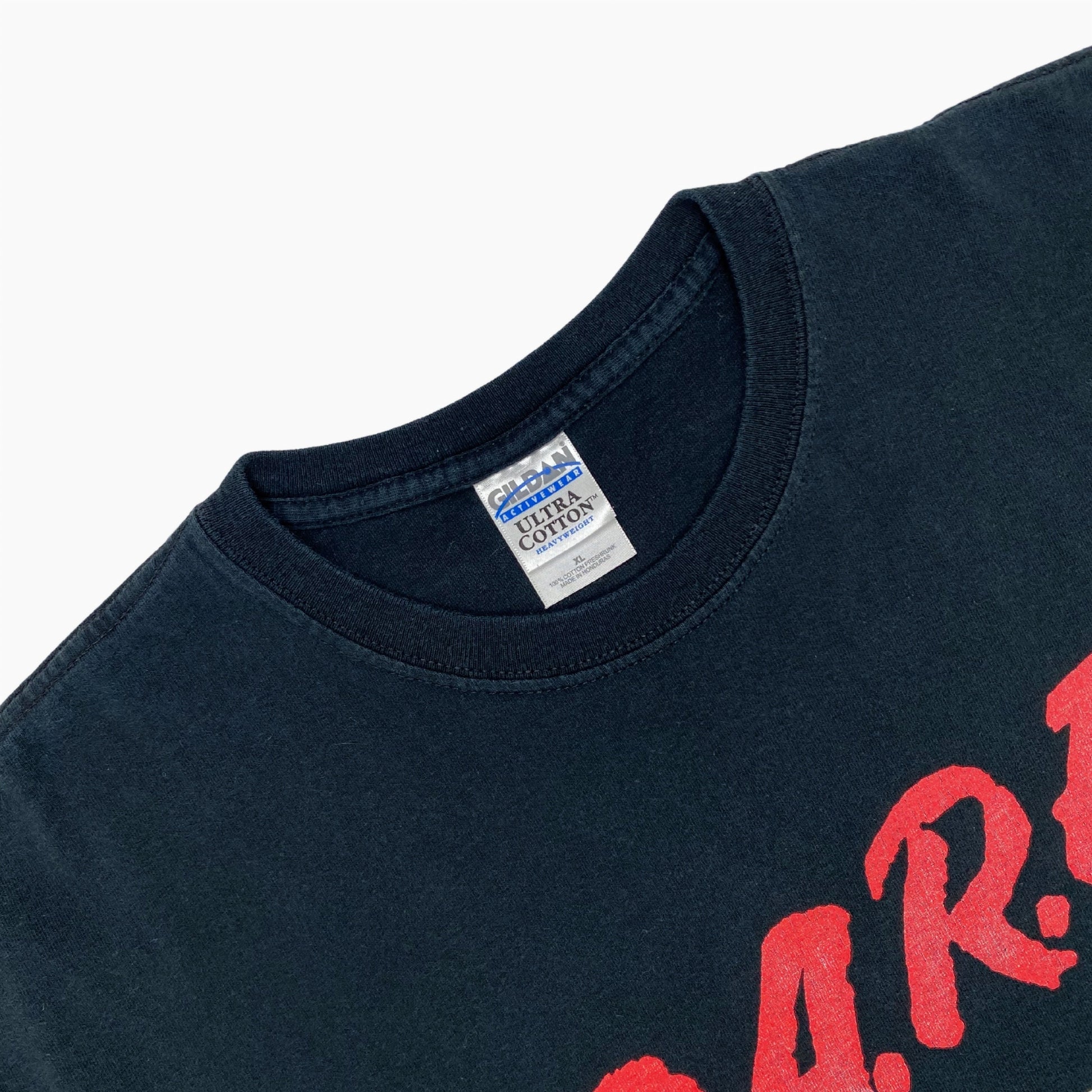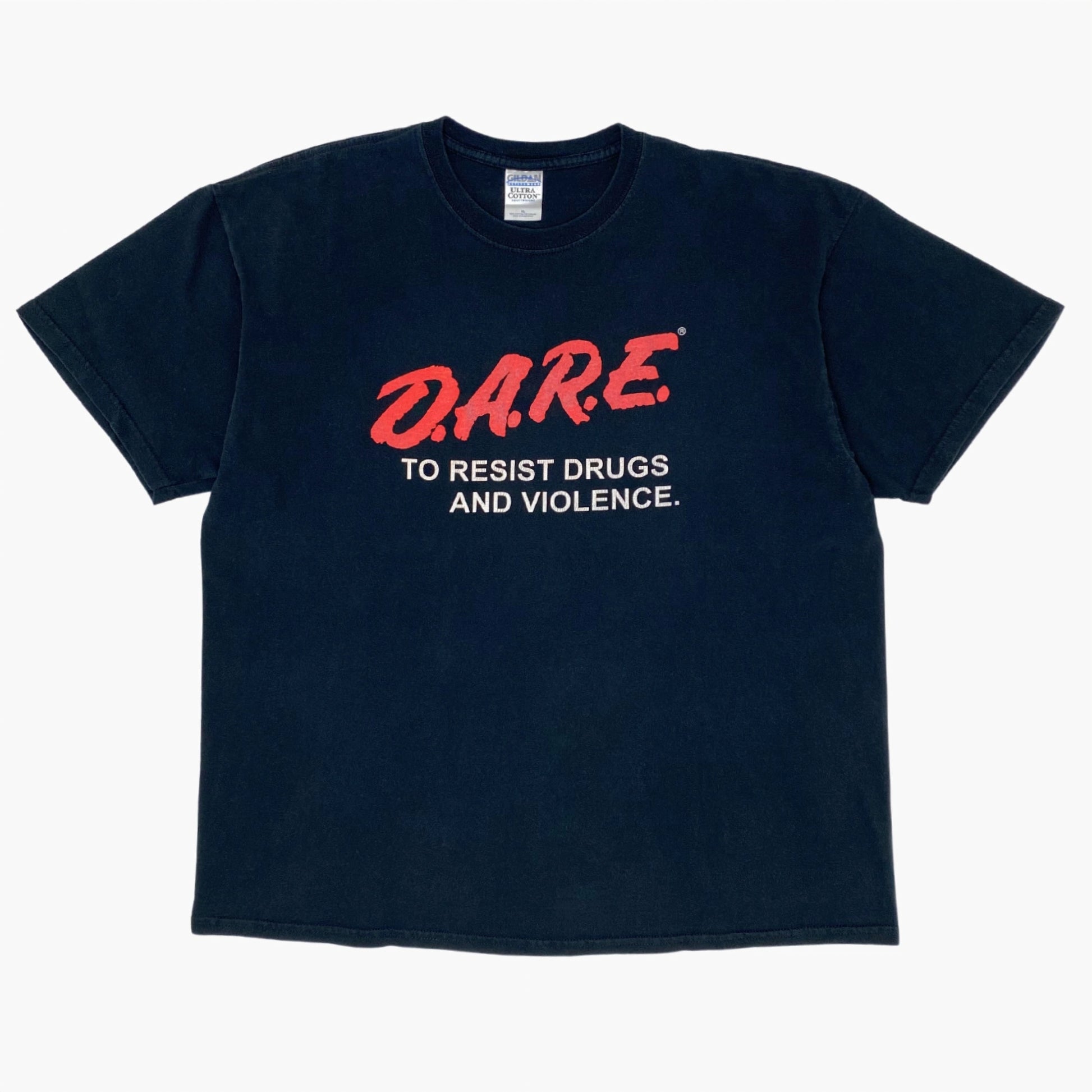 An ultimate classic D.A.R.E. to resist drugs and violence shirt in black as part of Americas attempt to educate the youth about the impact of drugs and anti social behaviour in the 80s-2000s. Comes on a 2001 Gildan ultra cotton heavyweight.