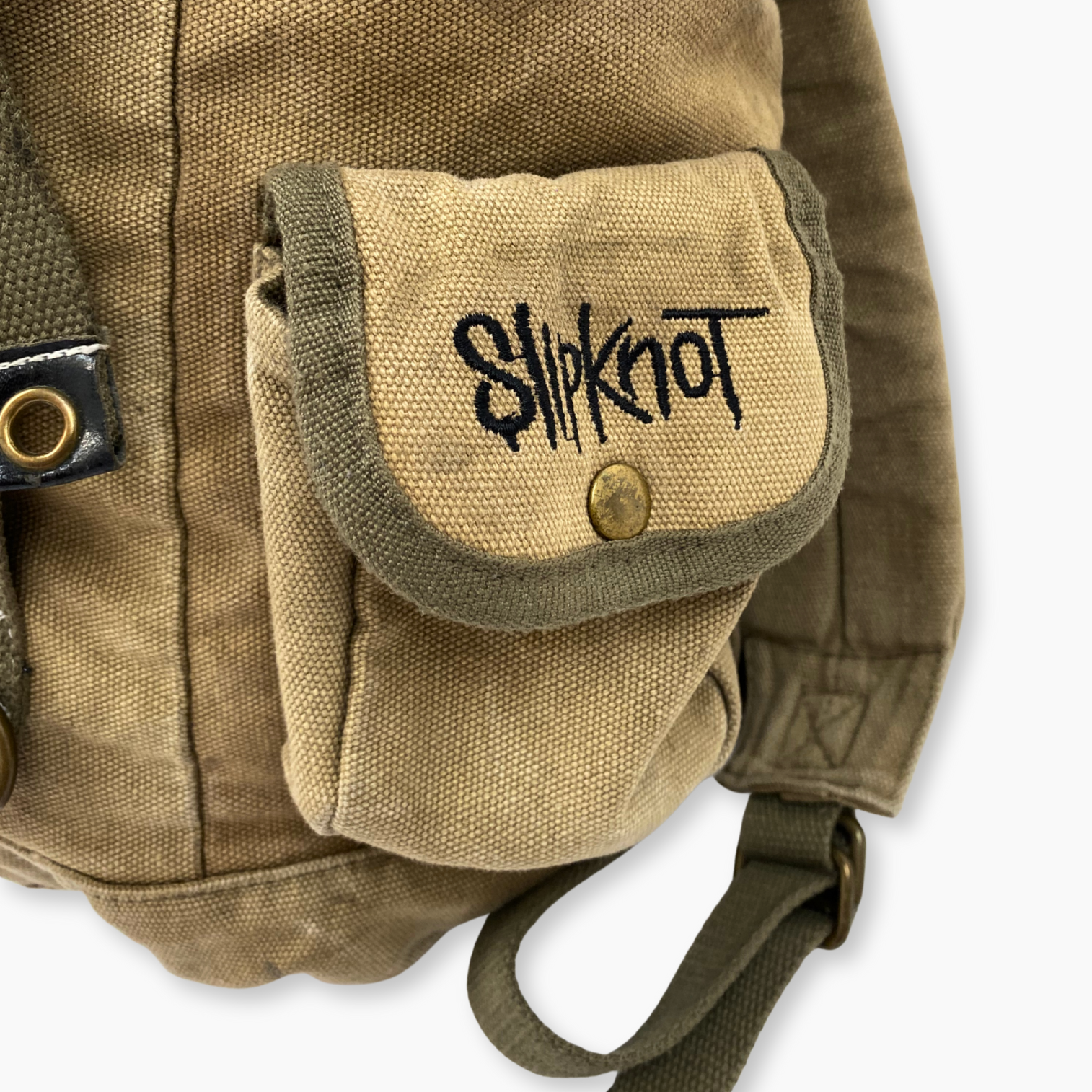 A real cool Slipknot backpack officially licensed from 2007. Comes in the form of a military/utility style bag with many useful compartments and even serves well for school with a stationary compartment. Insane detail has gone into this bag all over.