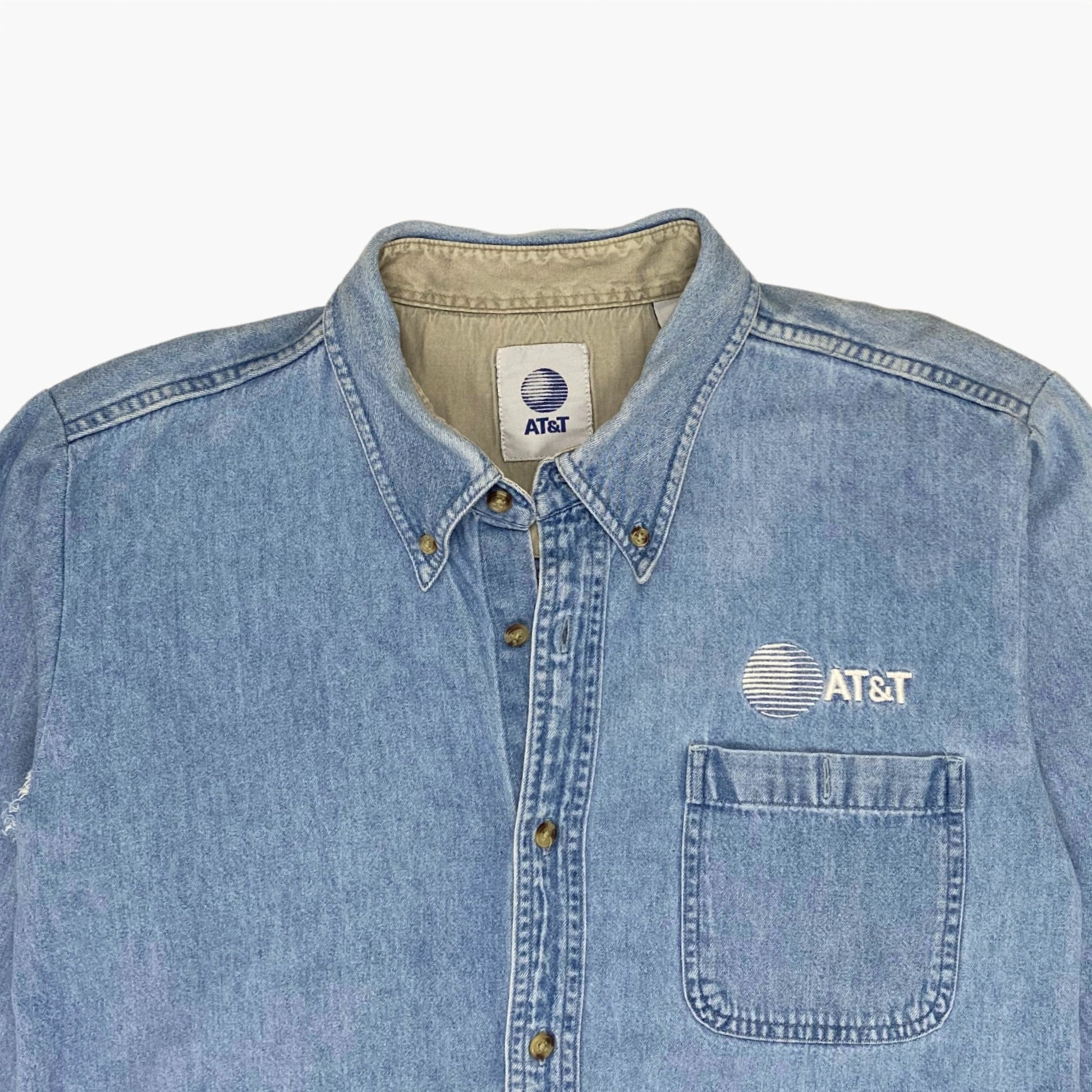 A cool 90s AT&T denim staff shirt from the 90s. Comes in a really nice faded blue with the company logo embroidered above the front pocket and on the back of the shirt.