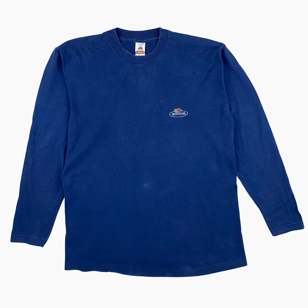 A nicely navy blue faded 90s tagged Fruit of the Loom long sleeve with the timeless logo printed on the chest left side.